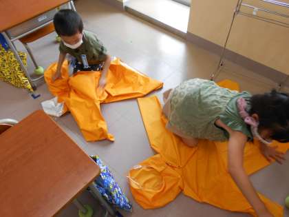 今朝は雨が降っていたので、1年生の子供たちは、かっぱを着て登校しました。帰りに乾いたかっぱをみんなでたたみました。家で練習してきた子もたくさんいて、てきぱきとたたむことができました。進んで友達を手伝う姿が頼もしかったです。