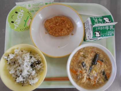 今日の献立は、牛乳、とんかつ、わかめご飯、かき玉スープ、メロンゼリーです。久しぶりに学校で調理された給食です。温かくて、とてもおいしかったです。