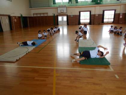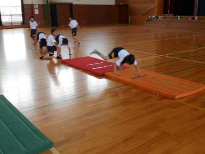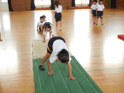 今日の体育の時間は、「クマ歩き」や「クモ歩き」、「あざらし」等、色々な動きをしました。初めてのマット運動でしたが、子供たちは、声をかけ合い、協力してマットを準備したり、片付けたりすることができました。