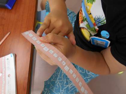 算数科の時間に長さの学習をしています。今日は、自分の体や、身の回りのものから1センチメートルの物をさがしました。1センチメートルの量感を感じることができたようです。また、物差しのどの部分を使ってはかってもよいことに気付いていました。
