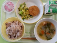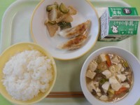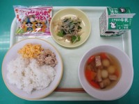 今日の献立は、牛乳、フルーツ白玉、ハヤシライスです