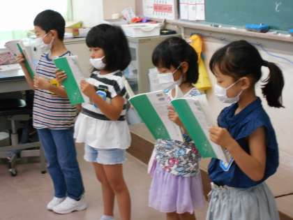「しょうがっこう かぶ」チームと「すーぱーがーるず あんど ぼーいず」チームです。姿勢よく、はきはきと音読していました。