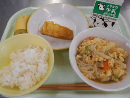 今日の献立は、ご飯、牛乳、揚げ魚のレモン味、親子煮、バナナです。明日の給食は牛乳、食パン、ソフトカレイフライ、クリーム煮、いちごジャムです。楽しみですね。