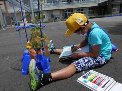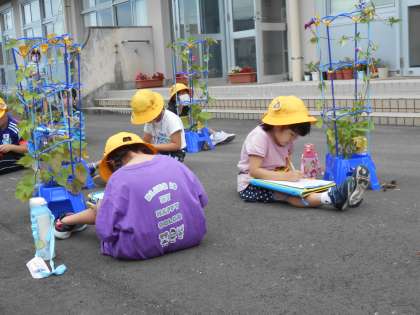今日は、あさがおの観察をしました。風が強かったので、あさがおも子供たちも飛ばされないように必死でした。