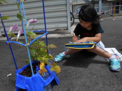 あさがおの成長を喜び、黙々と観察している子供たちです。