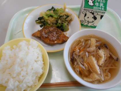 簡易給食から配膳しやすい給食へ、そして今日から通常の給食です。今までより副菜が一つ増えます。主にお野菜です。今日の献立は、ご飯、牛乳、魚のエゴマ味噌かけ、小松菜ひたし、さわにわんです。明日は、ご飯、牛乳、豚肉のおろし炒め、ゆかりあえ、ジャガイモの味噌汁、バナナ、のりの佃煮です。