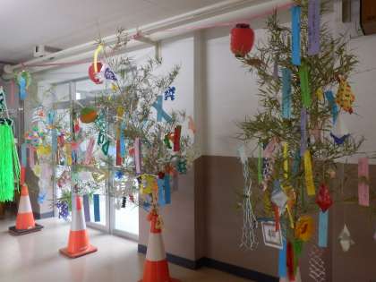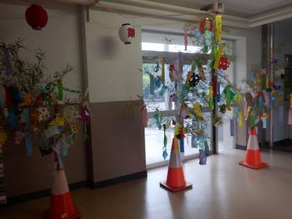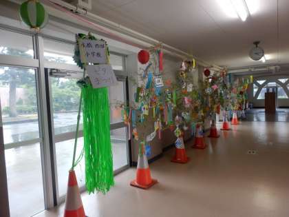 今学期は、コロナウイルスの影響で七夕に関する集会ができないため、集会委員会の呼びかけで、学年ごとに七夕飾りをつくりました。現在は中央廊下に展示中です。それぞれの学年で作った飾りや飾り方が異なり、それぞれの笹が良い味を出しています。元々は、織物が上手な織り姫にあやかって、何かが上達するようにと願いを込めたそうです。天瀬っ子の笹のには、習い事の上達の他に、コロナが終息するように願ったものや、家族の手伝いを宣言するものなど様々です。願いが叶うといいですね。