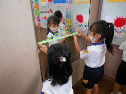 「どっちが長いかな?」「こんなに長いよ!」と声をかけ合いながら、ペアで協力して活動していました。楽しく活動し、あっという間に時間が過ぎました。