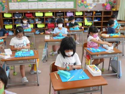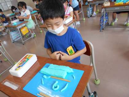 今日は、小学校で初めて粘土を使いました。この日をずっと楽しみにしていた子供たち。毎日のように「先生、粘土はまだ?」と確認にきていました。