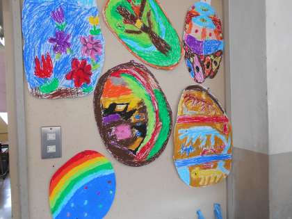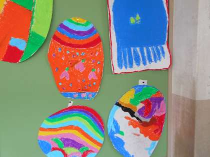 図画工作科の時間に自分だけの「ひみつのたまご」を描きました。生まれてくるものを想像しながら、たまごを作りました。