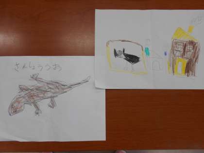 絵を見せながら、S君は「見て見て!サンショウウオ!」、T君は「おばあちゃんの家の犬がかわいいよ。お散歩も一緒にしたよ!」と、にこにこ話してくれました。S