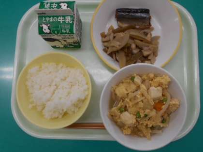 今日の献立は、ごはん、牛乳、さんまのマーマレード煮、茎わかめのきんぴら、卵とじです。