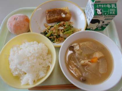 今日の献立は、ご飯、牛乳、揚げ出し豆腐のごまだれかけ、煎り大豆和え、冬瓜の味噌汁、冷凍ミカンです。明日の給食は、食パン、牛乳、ウインナー、枝豆サラダ、夏野菜スパゲッティです。