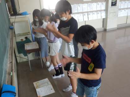 4年生では、クラッピング(手拍子)が入る曲に取り組んでいます。打つタイミングが違う、2種類の手拍子と鍵盤ハーモニカのメロディーが合わさる、とても楽しい曲です。グループに分かれて手拍子の練習をしています。まだまだタイミングが合わないところもありますが、頑張っています。