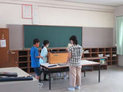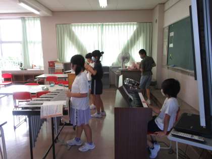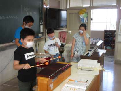 音楽科の時間には、様々な楽器をつかって合奏をしています。子供同士で話し合いながら、音の重ね方や大きさなどを工夫して取り組んでいます。