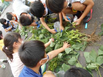 収穫した枝豆をみんなで分けたり、うどんこ病がひどい葉をはさみで切ったりしました。