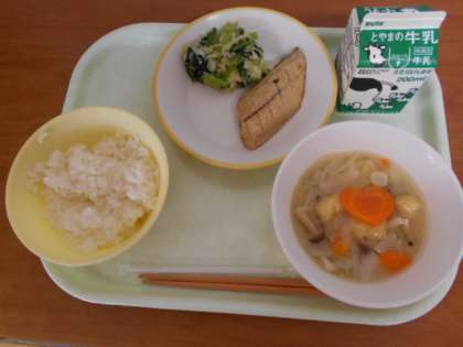 今日の献立は、ご飯、牛乳、鰆の幽庵焼き、昆布和え、味噌汁です。明日の献立は、ご飯、鶏肉のマーマレードソースかけ、花野菜サラダ、かき玉スープです。