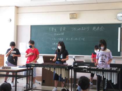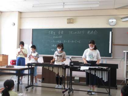 今日は、校長先生や保健の先生を招待して合奏を披露しました。練習の時には、どのように音を重ねるのか等、子供同士で話し合いながら取り組んでいました。本番では、練習の成果を発揮し、すてきな合奏をすることができました。次の合奏も期待しています。