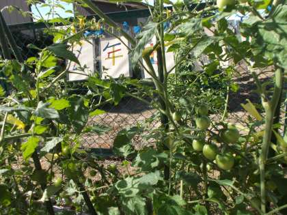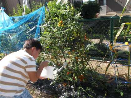 今日で夏休みが終わります。長かった梅雨が明け、暑い日ばかりの夏休みでした。「2年生にこにこ農園」のトマトはこの暑さにも負けず、どんどん実らせています。どうしてかというと、2年生の子供たちが、自主的におうちの人と水やりに来てくれているからなのです。担任もこの暑さでトマトが心配になり、見に来るのですが、いつも土が濡れています。2年生のみなさん、そしてご家族のみなさん、本当にありがとうございました。トマトは、たくさんの愛情という栄養をもらい、にこにこ喜んでいるようです。うどんこ病もかなり少なくなり、わき芽畑にも大きな実ができてきました(写真3枚目)。
