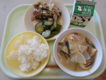今日から2学期の給食始まりました。今日の献立は、ご飯、牛乳、豚肉の塩麹炒め、きゅうりの華風和え、すいとんです。明日の献立は、ご飯、牛乳、鯖の照り焼き、はりはりソテー、じゃがいもの中華煮です。