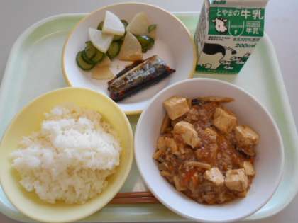 今日の献立は、ご飯、牛乳、サンマの土佐煮、華風和え、麻婆豆腐です。明日の献立は、ご飯、牛乳、えごま入り卵焼き、アスパラのごまだれ、ブラックラーメンです。