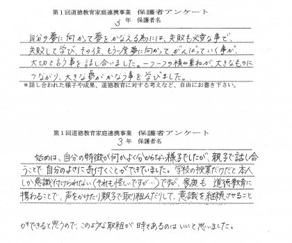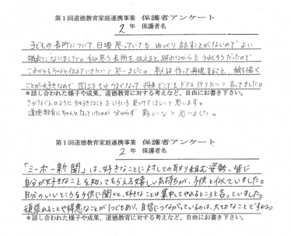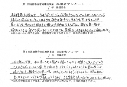 道徳教育家庭連携事業 1 公開日 2020/08/31 更新日 2020/08/31 お知らせ 第1回道徳教育家庭連携事業に、ご協力くださりありがとうございました。 アンケートから、保護者の方々がお子様とじっくり話し合ってくださったこと、お子様の成長を感じたり今まで気付かなかった一面に気付いたりされたこと等、様々な思いを感じることができました。私たちも保護者の皆様の思いから学ぶことがたくさんありました。 1,2、3年生の保護者アンケートからいくつか紹介します。