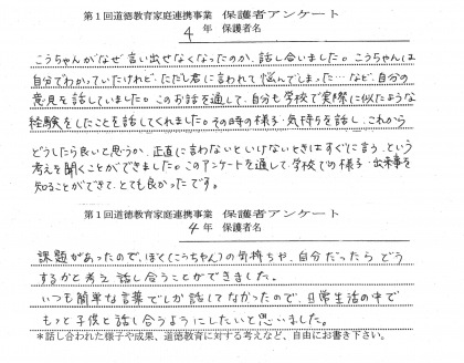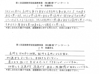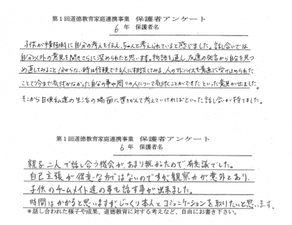 道徳教育家庭連携事業2 公開日 2020/08/31 更新日 2020/08/31 お知らせ 4、5、6年生の保護者アンケートからいくつか紹介します。 今後も各学期1回のペースで続けていきたいと思いますので、ご協力お願いいたします。