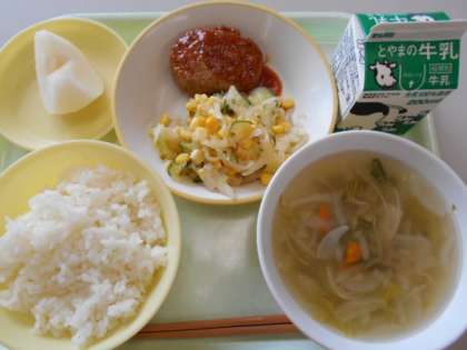 今日の献立は、ご飯、牛乳、ハンバーグのマスタードソース煮、コーンサラダ、レタススープ、梨です。明日の献立は、ご飯、牛乳、揚げ魚のレモン味、いんげんのごま和え、味噌汁です。