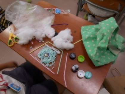 身の回りにある材料をよく見て、触って、どんな感じがするか、何に見えるかじっくりと考えました。そして、いろいろな置き方や組み合わせを試しました。