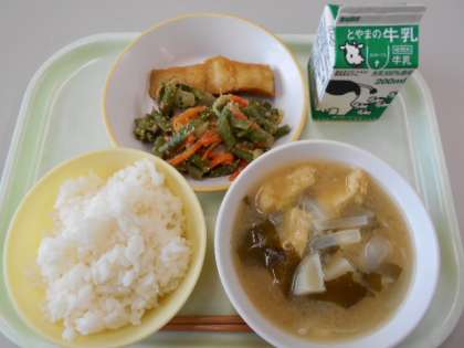 今日の献立は、ご飯、牛乳、揚げ魚のレモン味、インゲンのごま和え、味噌汁です。来週月曜日の給食は、ご飯、牛乳、ワカサギのフリッター、梅肉和え、肉じゃがです。