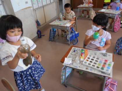 ペットボトルのふたを閉め忘れて、ペットボトルを振ってしまい、色水まみれになるというかわいらしいハプニングもありました。