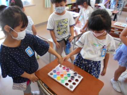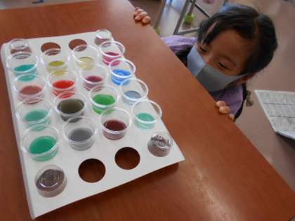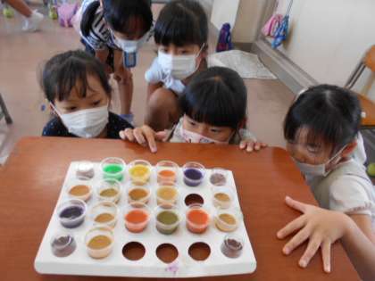 色水作りが終わった後は、友達と、作った色水を見合いました。自分の作った色味とはちがうものにも反応し、「きれいだね」と伝えていました。みんなで囲み、感想を言い合う姿がかわいらしかったです。