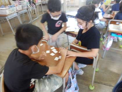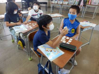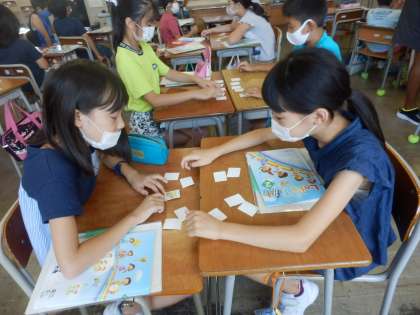 4年生外国語です。ALTの先生と一緒に行っています。いまは、”What time do you〜”について学習しています。何時にどんなことをしているのかを英語で聞き取ったり、話したりしています。