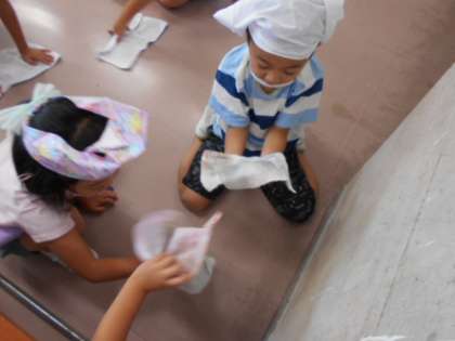今日から、朝の清掃が始まりました。子供たちは、前日に習った掃除の手順や担当の場所をよく覚えており、ぴかぴかにしていました。一通り終わっても、2回目、3回目と、黙々と繰り返し取り組む姿が素敵でした。