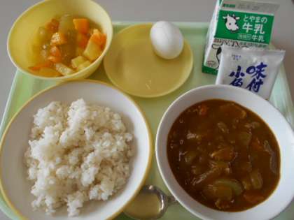 今日の献立は、カレーライス(麦ご飯)、牛乳、ゆで卵、味付け小魚、フルーツゼリーミックスです。明日の献立は、ご飯、牛乳、豆とかぼちゃのコロッケ、株の彩り、根菜汁、りんごヨーグルトです。