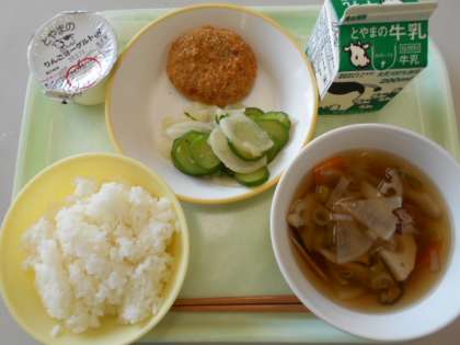 今日の献立は、ご飯、牛乳、カブの彩り、豆とかぼちゃのコロッケ、根菜汁、りんごヨーグルトです。明日の献立は、ご飯、牛乳、鶏肉の照り焼き、なすのオイスターソース炒め、関東炊きです。