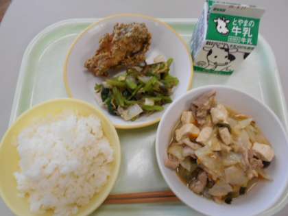 今日の献立は、ご飯、牛乳、鰺のえごま揚げ、とろろ昆布和え、豆腐のチャンプルーです。来週水曜日の献立は、ご飯、牛乳、豚肉のキムチ炒め、きゅうりもみ、ミニトマト、さわにわん、ポケットチーズです。