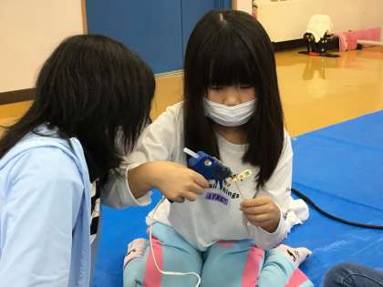 羽に絵を描いて、竹串と合わせてグルーガンで止めます。グルーガンも熱くなるのでやけどに注意です。