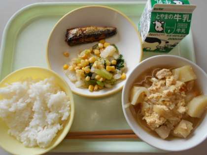 今日の献立は、ご飯、牛乳、鰯の紀州煮、コーン和え、親子煮です。明日の献立は、ご飯、牛乳、チンズワンズ(餅米シューマイ)合わせ和え、茎わかめのスープ、バナナです。