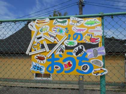 校長先生が、スキー山に「むしたちのおうち」を作ろうと提案してくださいました。そこで、虫が大好きな2年生が看板の絵を描きました。