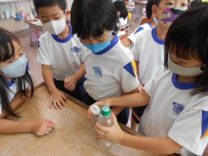 どうやって比べたらよいかを考えました。和気あいあいとした相談タイムでは、ペットボトルをよく見て、触って、一生懸命考えていました。
