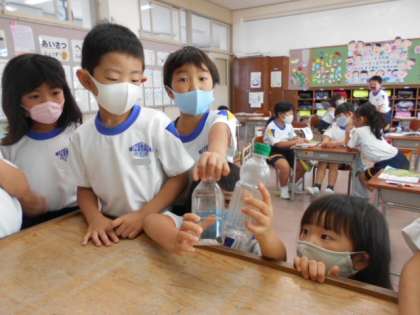 実際に水を使って、比べてみると、子供たちは真剣なまなざしで見つめ、「やっぱりこっちだ!」「まだ入る!」と盛り上がっていました。