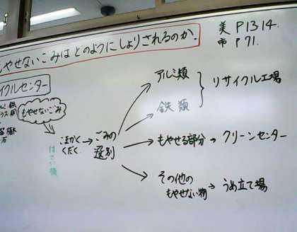 ぼくは、今日の社会でゴミはどこに処理されるのかを調べました。アルミや鉄類はリサイクル工場、燃やせる物はクリーンセンター、その他燃やせないものは埋め立て場だということが分かりました。