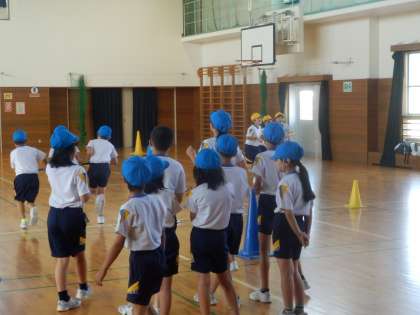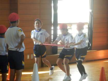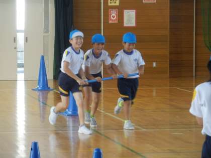 運動会まで3週間となりました。結団式を皮切りに、各競技の練習が少しずつ開始されています。3・4年生では、台風の目を行います。今日は、走る順番を決め、動きを少し練習しました。体育館だったので、走る距離も台風の大きさもミニサイズです。今度は広いグラウンドで大きな台風を作りましょう。