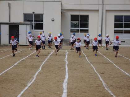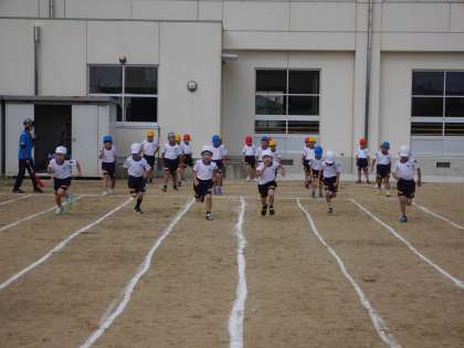 2年生は、速く走ることができるように、動きのポイント意識しながら走る練習をしています。