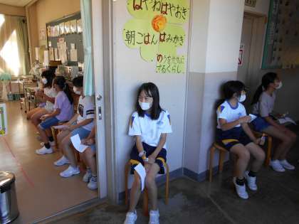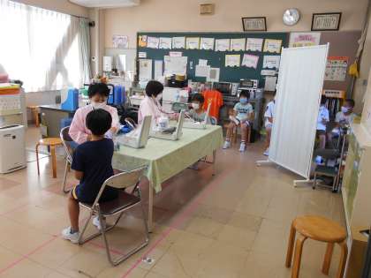 今日は、腹囲・血圧測定、採血をしました。初めは緊張した表情や言葉が見られましたが、教室へもどる時には、とても健やかで爽やかな表情で戻っていきました。とても落ち着いて検診を受けていました。