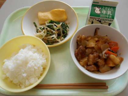 今日の献立は、ご飯、牛乳、卵ロール、ナムル、酢豚です。明日の献立は、ご飯、牛乳、ブリの照り煮、きざみ和え、具沢山汁です。