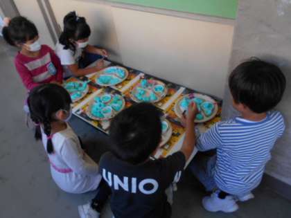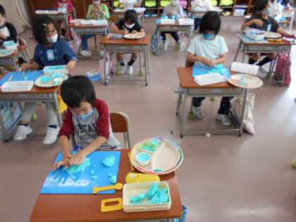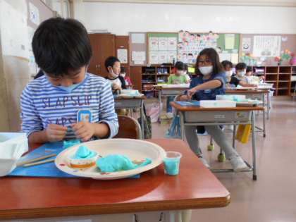 今日の図画工作科の学習では、粘土でごちそうを作りました。お皿も、一人一人のオリジナルです。