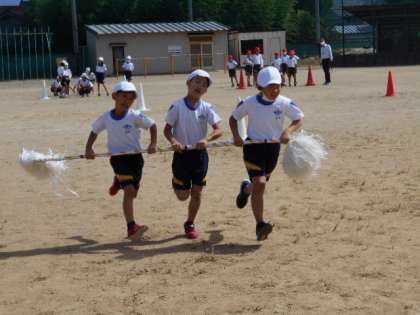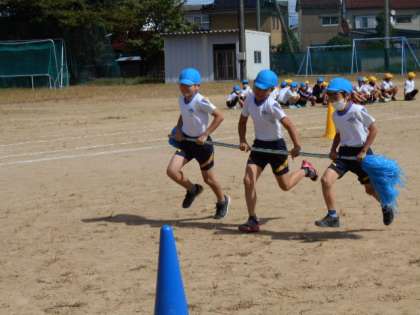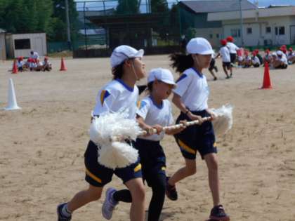 次は3・4年生です。5・6年生に見てもらいながらの練習です。5・6年生に比べると小型台風ですが、笑顔をふりまきながら走って行きます。爽やかです。