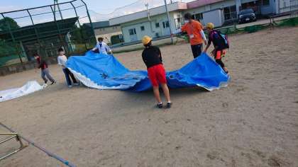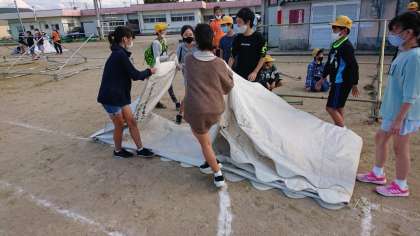 帰りの会が終わり、有志でテントの幕を片付けました。先生方から教えていただきながら、幕を折りたたんだり運んだりしている子どもたちです。頼もしい!